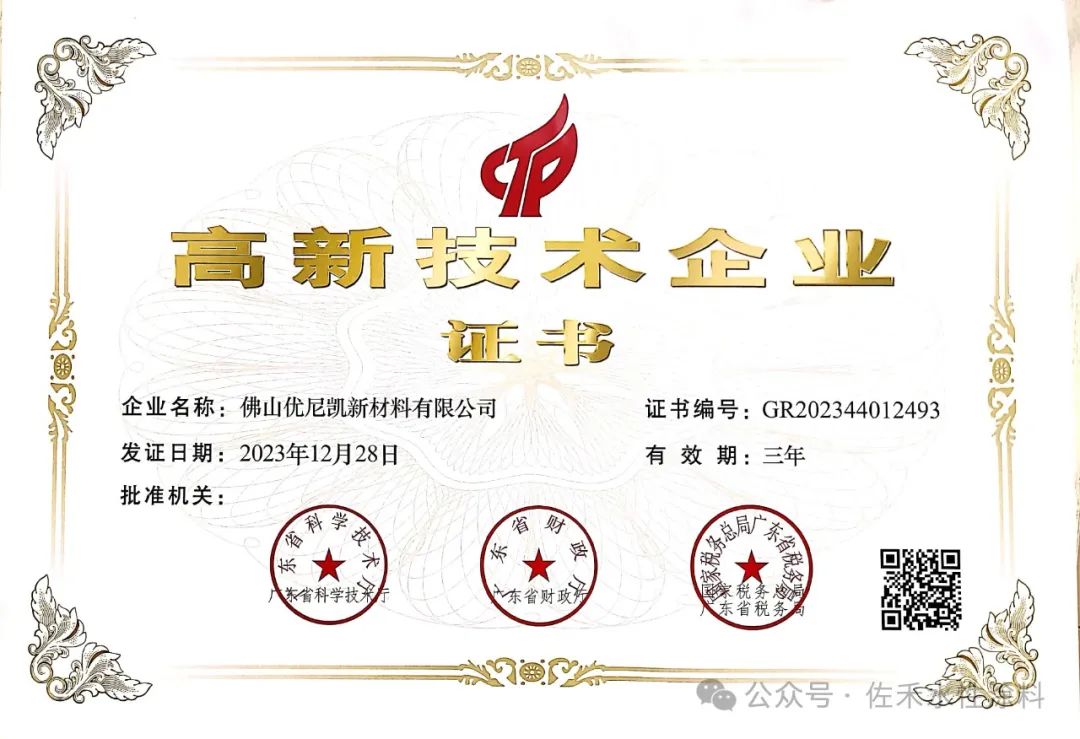 国家高新技术企业评审认定工作是由国家发改委、财政部、税务总局等部门组织实施的,在广东省发改委公布的2023年度第三批评审过关企业名单中,佛山优尼凯新材料有限公司名列其中,正式获得国家高新技术企业认定。